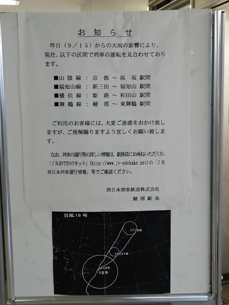 身動きが取れないので取り合えず雨の止んだ10時半までホテルに留まり、綾部駅に向かうも列車が不通状態。