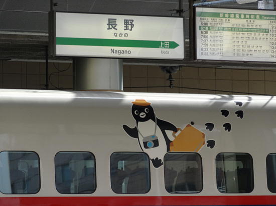 こちらは新幹線の側面にペンギンが居たので駅名標といっしょに。
