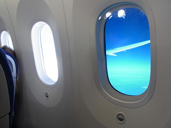787はカーテンが電子式で窓下になる上下のスイッチで多段階で窓が青色に。